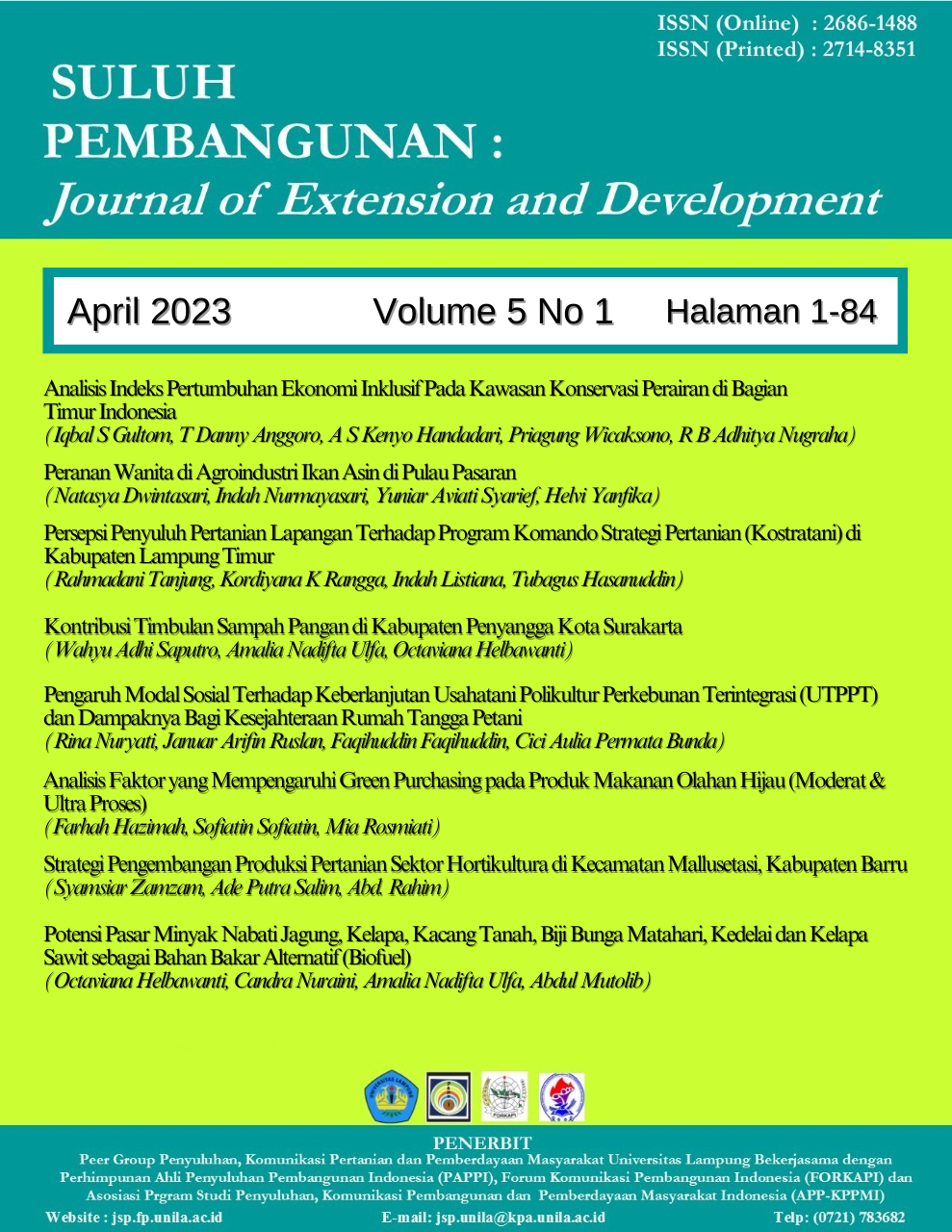 Gultom, I., Anggoro, T. D., Handadari, A. S., Wicaksono, P., & Nugraha, R. B. (2023). Analisis Indeks Pertumbuhan Ekonomi Inklusif Pada Kawasan Konservasi Perairan di Bagian Timur Indonesia. Suluh Pembangunan : Journal of Extension and Development, 5(1), 1-10. https://doi.org/10.23960/jsp.Vol5.No1.2023.165
